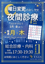 4月より夜診受付が月・金曜日 → 月・木曜日へ変更になります